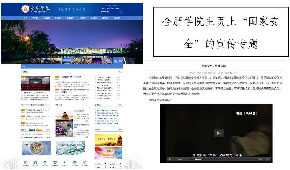 為了使廣大師生更好地學習了解《反間諜法》,進一步增強國家安全意識,合肥學院國際合作交流處積極部署反間諜法宣傳的相關工作,利用校園多個平臺向全校師生普及反奸防諜知識,并組織專家為單位開展反奸防諜的講座報告。首先,國際交流合作處充分利用學校的網絡資源,在首頁醒目位置設立國家安全專題,同學們可以通過首頁點擊到國家安全宣傳主頁http://www.zz9w.xyz/dd/f2/c14a56818/page.htm,接受國家安全的相關知識教育和觀看反間諜案例。國家安全宣傳主題作為學校常駐頁碼,一年365天無休向師生宣傳。