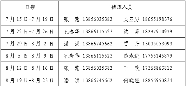 二、暑期安排值班,請(qǐng)各科室根據(jù)工作分工和學(xué)校重點(diǎn)工作合理安排時(shí)間,抓好巡視整改、文件修訂、教育教學(xué)審核評(píng)估、黨紀(jì)學(xué)習(xí)教育、對(duì)外合作交流等重點(diǎn)工作落實(shí)。