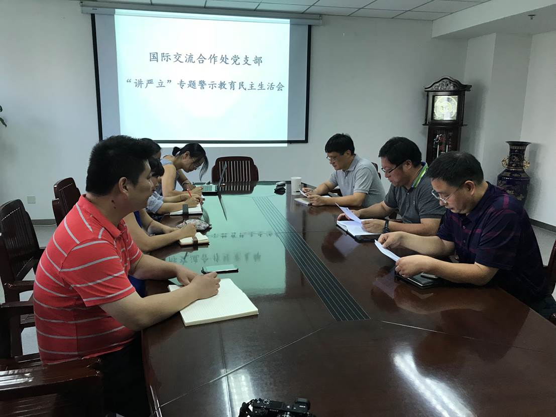 賈峰書記首先帶領大家學習了《合肥學院關于在全院黨員領導干部中開展“講忠誠、嚴紀律、立政德”專題警示教育的方案》和蔡敬民書記近期在“講嚴立”專題警示教育黨課的講話,強調了本次專題警示教育活動的必要性和嚴肅性,傳達了學院黨委對活動的總體要求,安排布置國際處黨支部開展活動的具體步驟及方法。他代表班子對照分析檢查材料,圍繞“講嚴立”主題,對照黨章黨規黨紀,以魯煒等案件為反面教材,聯系我省“陳樹隆、楊振超、周春雨”等案件,以“三嚴三實”原則審視“不忘初心,牢記使命”,認真審視自身思想、工作、生活和作風實際,深入進行剖析,擺“癥狀”、找“病根”、開“藥 方”,深刻反思,汲取教訓,查找班子身存在問題和不足,剖析存在問題的原因,提出今后整改措施和努力方向。