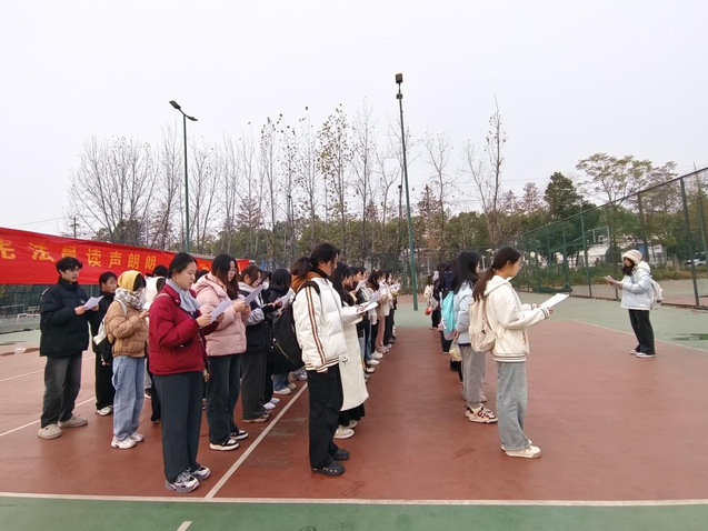 12月13日清晨,參加活動的學生以飽滿的精神狀態在一期校園體育場集合?;顒右潦?,全體學生排好隊形,整齊肅立。隨后,在領讀同學的帶領下,一起朗讀《憲法》的節選內容。天氣雖然寒冷,但我院學子神情專注而又莊重,朗讀聲清晰而又堅定。在每一聲鏗鏘有力的聲音中,學生們用昂揚向上的熱情驅散了寒意,用奮進拼搏的姿態推動了憲法晨讀活動走向高潮。