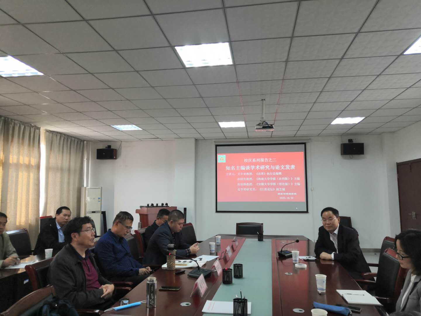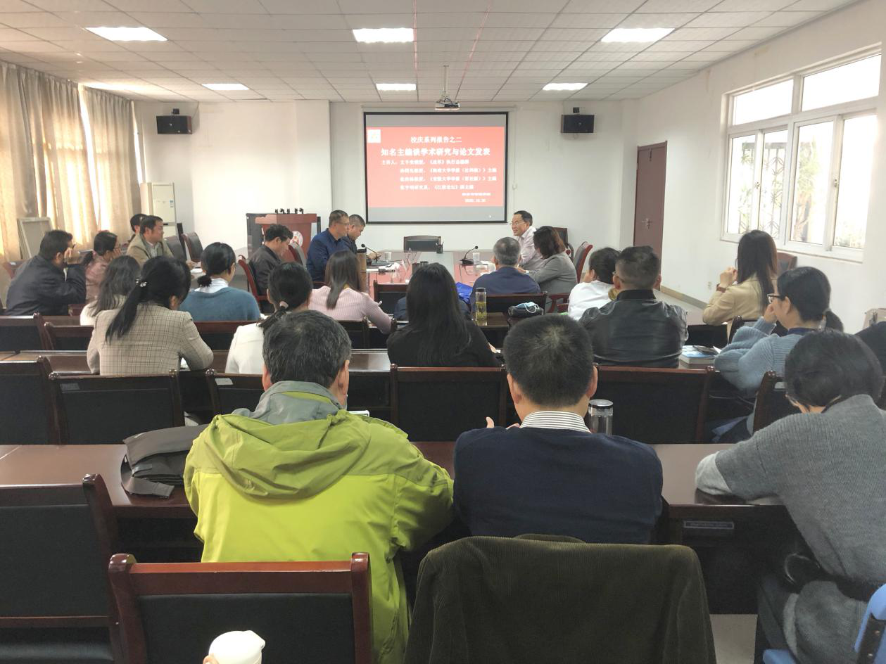 10月30日下午,主題為“知名主編談學術研究與論文發表”的專題報告在一期4號樓會議室舉行。《改革》主編文豐安教授、《海南大學學報(社科版)》主編孫紹先教授、《安徽大學學報(社科版)》主編張治棟教授和《江淮論壇》副主編張亨明研究員等應邀做主講嘉賓。報告由陳江華院長主持,副書記張永軍、經管學院研究生及部分教師參會。