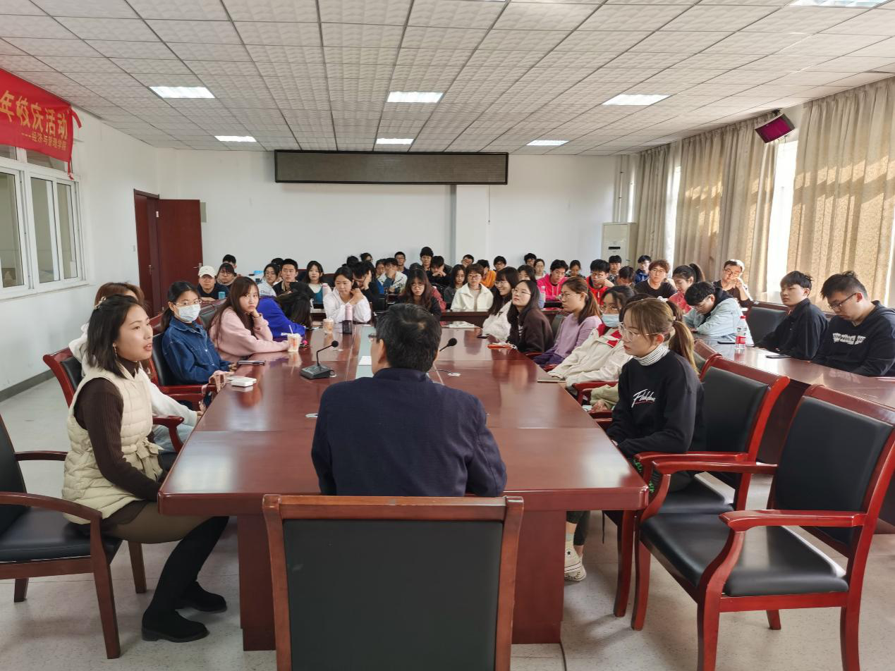 為迎接我校四十周年校慶,2020年11月10日,經(jīng)管學(xué)院中德物流校友座談會于我校一區(qū)博學(xué)樓B座二樓會議室召開。本次座談會邀請了我院14級中德物流校友張語嫣出席,經(jīng)管學(xué)院黨委書記楊學(xué)春、黨委副書記張永軍主持,經(jīng)管學(xué)院各年級中德物流專業(yè)學(xué)生參會。