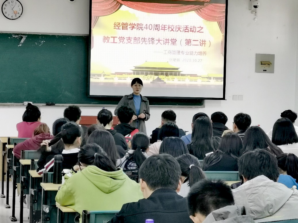 10月27日,工商管理專業(yè)能力培養(yǎng)先鋒大講堂在一區(qū)博學(xué)樓C座101教室順利舉行。經(jīng)管學(xué)院教工黨支部張艷麗老師就工商管理專業(yè)能力培養(yǎng)做出闡述。