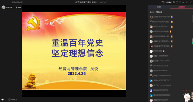2022年4月26日,經(jīng)濟(jì)與管理學(xué)院第六期全體入黨積極分子通過(guò)線上方式參與第七課《重溫百年黨史,堅(jiān)定理想信念》的學(xué)習(xí)。本次黨課由我院黨委委員、副院長(zhǎng)吳悅老師主講。
