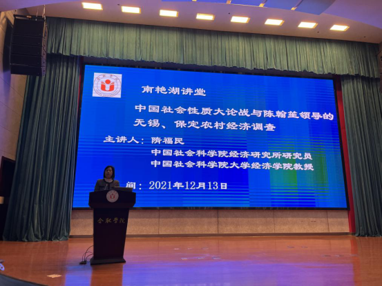 2021年12月13日下午,我校南艷湖大講堂第二講在二期圖書館報告廳A廳順利舉行,中國社會科學院經濟研究所研究員、中國社會科學院大學經濟學院教授、博士生導師隋福民作了題為“中國社會性質大論戰與陳瀚笙領導的無錫、保定農村經濟調查”的學術報告。校長吳春梅出席并主持報告會。經濟與管理學院院長陳江華、部分師生以及相關單位教職工出席。