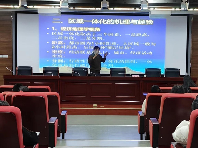 2023年12月28日下午,經(jīng)濟與管理學(xué)院在6棟一樓學(xué)術(shù)報告廳舉行了本年度最后一期“新文科經(jīng)管大講堂”,主題為“新發(fā)展格局與長三角一體化”,安徽大學(xué)宋宏教授主講。經(jīng)濟與管理學(xué)院教師、23級金融和會計專業(yè)研究生及部分本科生等共100余人到場聆聽。經(jīng)濟與管理學(xué)院院長陳江華主持。