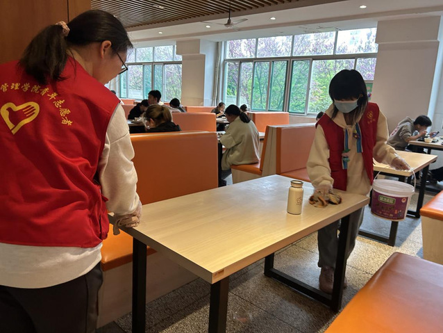 為營造食堂文明舒適的就餐環境、倡導節約用餐的優良行為,2024年4月2日,經濟與管理學院青年志愿者們前往一期食堂展開志愿服務活動。