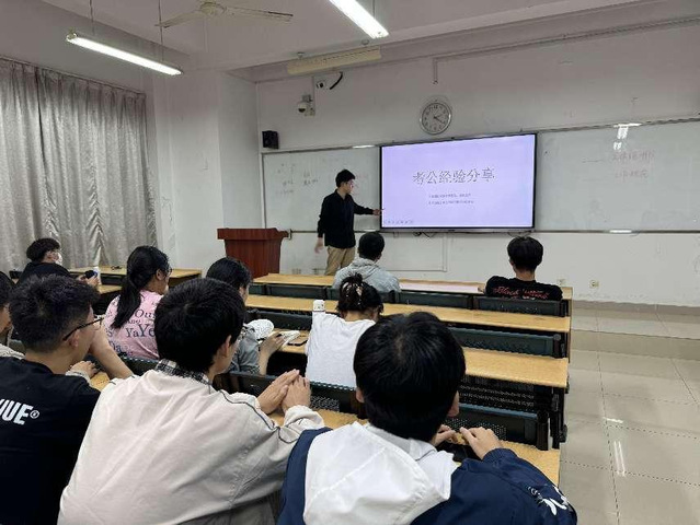 交流會中,唐肖峰同學詳細介紹了考研的成功經驗,段后鳴和趙雨陽同學分別為大家講述了在備考中的注意事項,以及考研失利后的自我調整和找工作的各項準備。蔡嘉、程國慶同學細致地為大家分享考公經驗,激勵大家備考期間不能松懈,同時也強調了考公崗位的多樣性,應當選擇適合的崗位。朱光迪同學從退役大學生士兵身份出發,詳細介紹了退役大學生士兵計劃在考研考公方面的優待政策。最后,張星老師對到場參加考研考公交流會的學長學姐表示感謝,希望同學們認真學習總結學長學姐的經驗,樹立正確的就業觀念,鼓勵同學們積極參與校園招聘會,端正就業價值觀。
