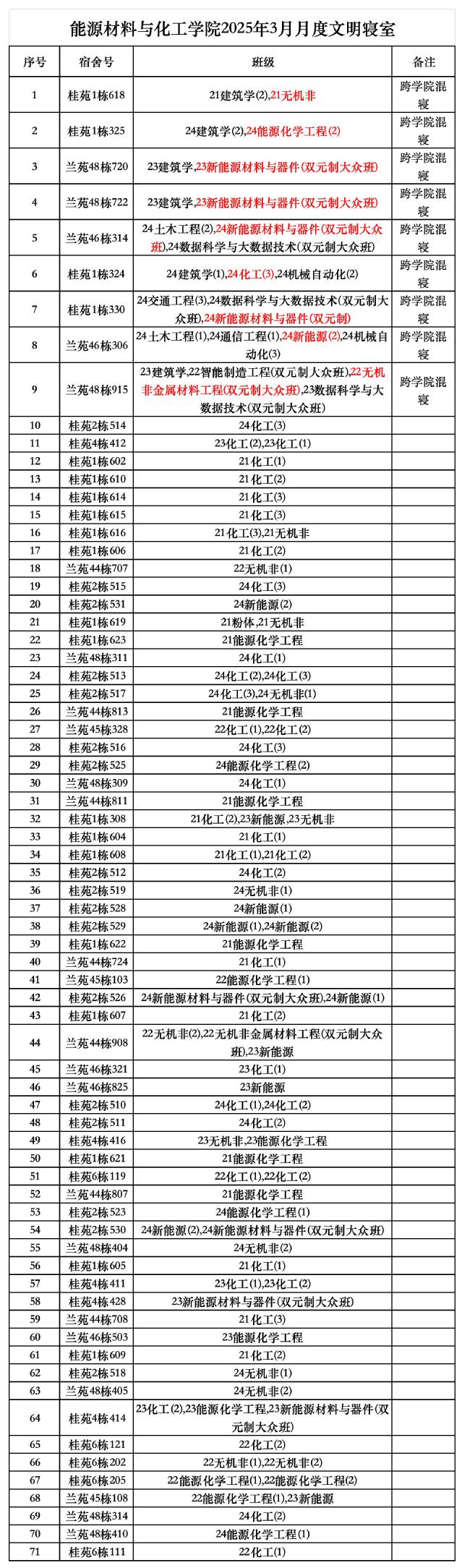 根據《合肥大學文明宿舍評選辦法》相關規定,遵循公開、公平、公正的原則,經學校和學院檢查評分,現將能源材料與化工學院3月文明宿舍名單進行公示,接受全院師生監督。如有異議,請在公示期間以書面或電話形式向院紀委或院學工辦反映。(擬獲獎名單見下圖)。公示日期為2025年4月10日至2025年4月17日。