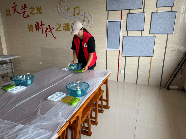 首先,志愿者們?cè)诔?span style="font-family:楷體, 楷體_gb2312, simkai;font-size:20px;">居委會(huì)教室內(nèi)準(zhǔn)備著活動(dòng)所需要用到的物品,例如橡皮泥,制作工具,盆子等,同時(shí)為避免環(huán)境臟亂,幫活動(dòng)場(chǎng)所的桌子鋪好了桌布,為本次活動(dòng)順利進(jìn)行提供了良好的開場(chǎng)基礎(chǔ)。