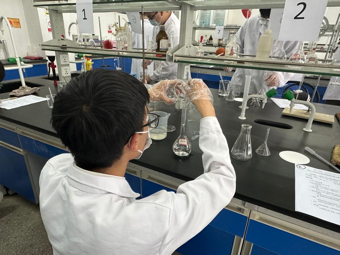 決賽為綜合實(shí)踐操作,實(shí)驗(yàn)環(huán)節(jié)從無(wú)機(jī)化學(xué)、分析化學(xué)、有機(jī)化學(xué)方面著重考察操作實(shí)驗(yàn)儀器、實(shí)驗(yàn)環(huán)節(jié)設(shè)計(jì)、實(shí)驗(yàn)數(shù)據(jù)記錄與處理等能力。比賽過(guò)程中,參賽選手們獨(dú)立思考,沉著冷靜,認(rèn)真進(jìn)行實(shí)驗(yàn)操作,展現(xiàn)了積極向上的良好風(fēng)貌,評(píng)委老師在一旁認(rèn)真觀察選手們的操作,保障實(shí)驗(yàn)的安全性與正確性。大家按照實(shí)驗(yàn)步驟有條不紊地進(jìn)行著,稱重、溶解、攪拌、定容,每一步都彰顯著選手們的實(shí)驗(yàn)操作功底與實(shí)驗(yàn)環(huán)節(jié)的熟悉,舉手投足間展現(xiàn)著他們的細(xì)致入微與嚴(yán)謹(jǐn)認(rèn)真。