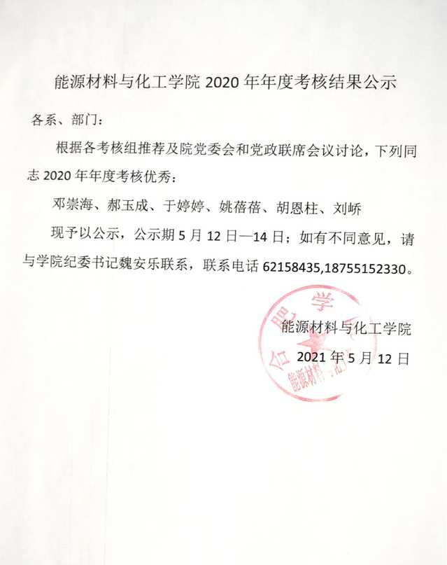 能源材料與化工學院2020年年度考核結果公示