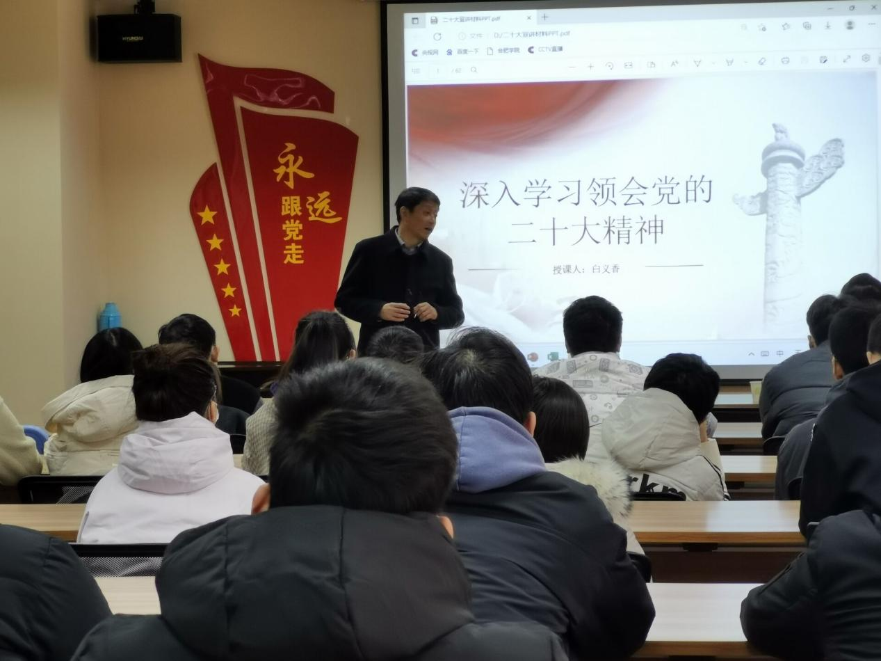 白部長首先介紹了大會的基本情況,然后圍繞著“舉什么旗,走什么路,以什么樣的姿態(tài)”傳授此次二十大會議的重要意義,從八個板塊梳理了二十大報告的要點。介紹了中國共產黨不忘初心、牢記使命,謙虛謹慎,敢于斗爭,總結了中國共產黨為什么行,中國特色社會主義為什么好的原因。白部長強調,通過學習二十大精神,在面對外國的文化入侵,面對國際上能源與物質的爭奪,面對百年未有之大變局時,我們要堅定自我,團結社會,堅定文化自信、制度自信、道路自信,要敢于斗爭、善于斗爭,要有志氣、有骨氣、有底氣。在疫情常態(tài)化防控形勢下,人與人,人與社會,人與自然應和諧相處。白部長鼓勵全體黨員從理論上學習,從實踐中收獲,牢記初心與使命,堅定不移向前走。