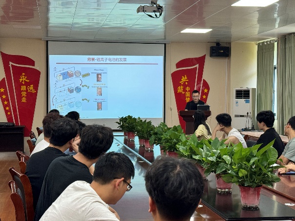 朱教授首先從介紹鋰離子的研究背景開始,高電壓錳基鋰離子電池因其潛在的高能量密度和低成本,成為當前研究的熱點之一,激發了同學們的研究興趣。而后詳細論述了通過優化電解液和正極材料,可以顯著提升電池的工作電壓和能量密度,尤其是錳基材料,因其豐富的資源、低廉的成本和優異的電化學性能,被認為是下一代高性能鋰離子電池的理想選擇。他強調高電壓鎳錳酸鋰在充放電過程中會經歷復雜的物相轉化,其結構動態對電池性能至關重要。同時,在全電池設計方面,研究人員開發了多種新型LNMO全電池器件,通過優化電解液配方和電極結構,實現了高能量密度和高安全性。最后,朱教授對報告進行了總結,本院師生和朱教授進行了互動交流,報告在全體師生的掌聲中落下為帷幕。