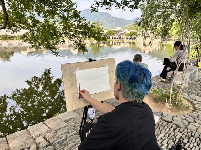 宏村素有“中國畫里鄉村”的美譽,白墻黑瓦、綠水青山的景象,構成了一幅“活著的水墨畫”。指導教師從取景、構圖、色彩運用等多個方面對學生進行悉心指導。在老師的手把手教學中,學生們不僅掌握了色彩技法,更深刻體會到了徽派建筑的獨特魅力與建造智慧。