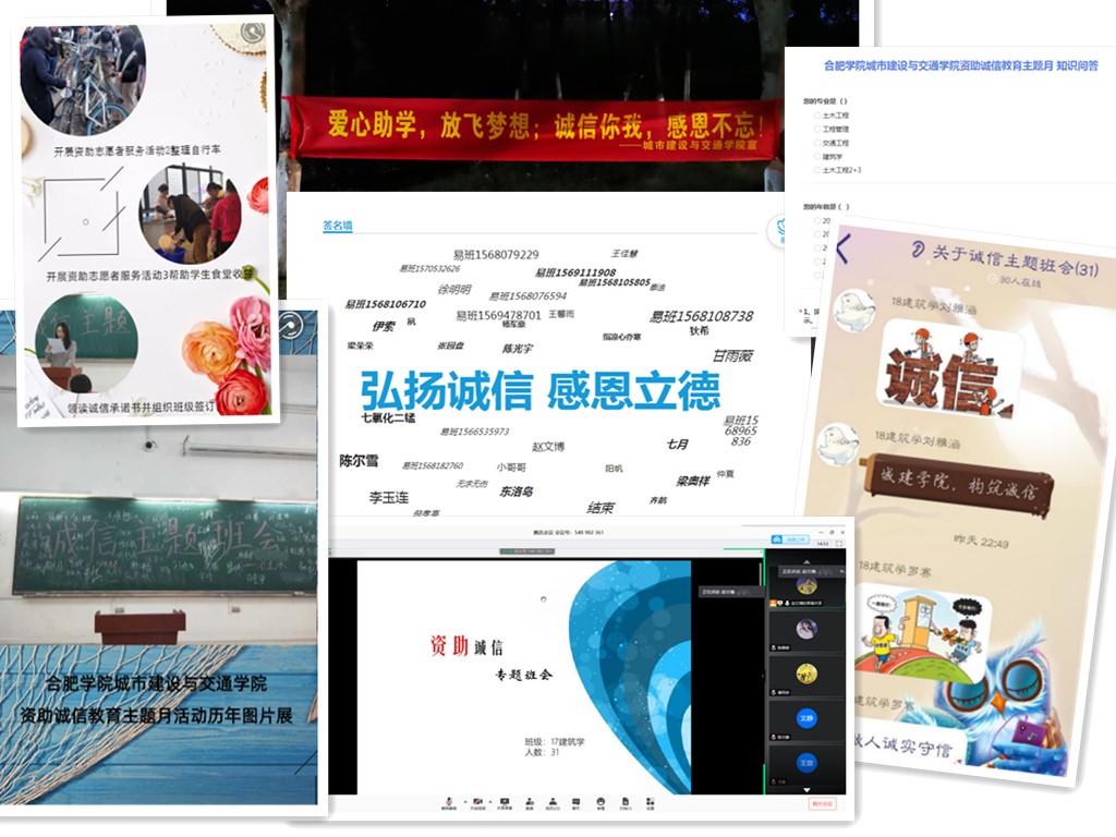 結(jié)合目前學(xué)生未全部返校的情況,我院創(chuàng)新工作形式,充分利用線上方式開展多種教育活動。第一,通過在易班平臺制作“資助誠信主題教育簽名墻”,以學(xué)生簽名形式強化誠信意識和責(zé)任感;第二,結(jié)合“問卷星”平臺在線開展知識問答活動,引導(dǎo)學(xué)生樹立珍愛信用、理性借貸、理性消費的意識,樹立正確的消費觀、榮辱觀、價值觀;第三,通過制作H5頁面圖片展,向同學(xué)們在線展示我院歷年開展主題月活動的圖片資料,用熟悉的環(huán)境、熟悉的面孔加深學(xué)生對資助誠信的理解,弘揚感恩精神。此外,各班以線上主題班會形式分別組織開展了資助誠信主題教育活動。