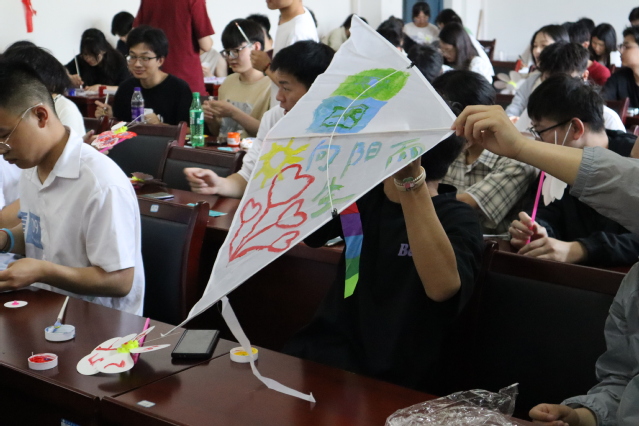 下午2:30,活動正式開始。同學們三人一組用事先準備好的紙、筆、顏料等工具開始制作風箏。同學們大膽想象,盡情地發揮自己的聰明才智,把風箏畫成自己喜歡的樣子,制作好的風箏可現場放飛,感受童年時的樂趣,放松身心。