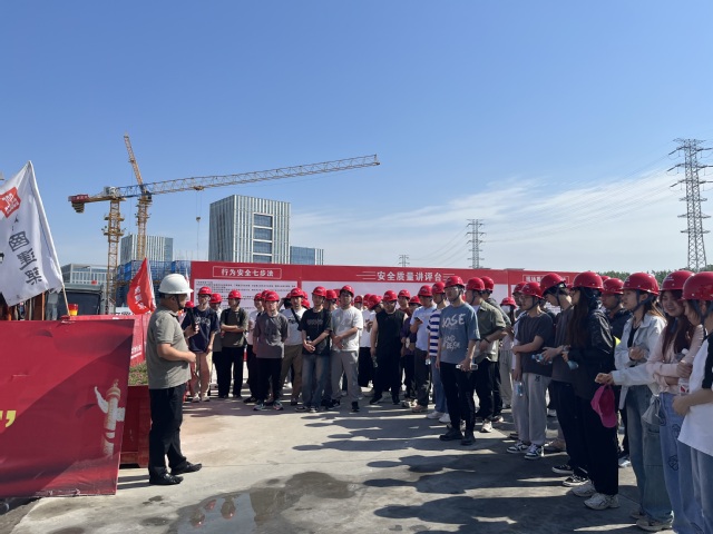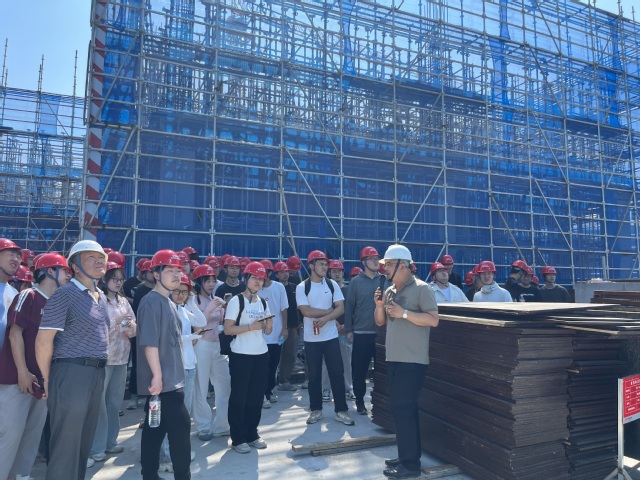 中建國際項目部對本次實習活動高度重視,熱情接待了同學們的到來。項目部領導帶領同學們參觀了項目現場,并對智能建造技術、綠色施工理念等進行了詳細介紹。現場技術人員圍繞安全文明施工、腳手架搭設、基坑支護等重要施工內容進行了細致講解,并與同學們進行了親切交流。同學們在現場認真聽講、積極提問,并將課堂所學知識與現場進行對照,收獲頗多。