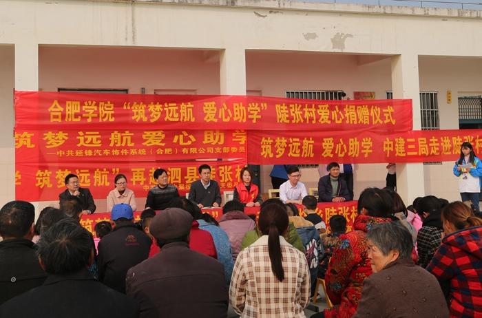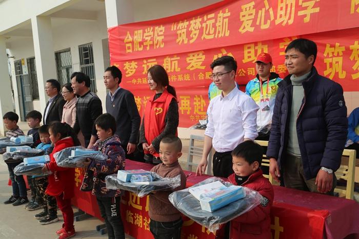 在團委齊俊老師帶領下志愿者們與始信居委會黨總支書記李正保以及轄區負責人一行前往陡張村。在校駐村干部朱世群老師的帶領下,捐贈儀式在陡張村聯合小學順利開展。李正保表示,此次活動非常有意義,通過校地聯動,愛心幫扶,使陡張村村民生活狀況有了很好的改善,希望今后加強雙方的志愿合作,祝愿合肥學院培養更多的學子為國家社會發展做出更大建設。青年志愿者學生代表閆順匯報了“筑夢遠航 愛心助學”陡張村幫扶活動近幾年開展以來取得的良好成效。大家為現場參與儀式的留守兒童和貧困學子分別發放了愛心物資,孩子們領到書包、學習用品都喜笑顏開,喜悅之情溢于言表。