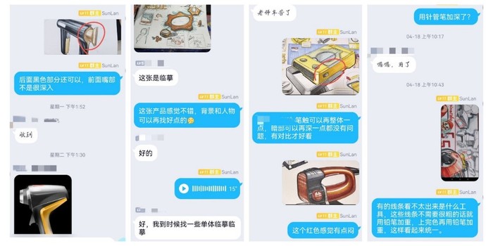 空間的阻隔讓孫老師難以全面掌握學生的學習狀態,更難以精準指導每位學生的手繪作業,為此,孫老師摸索出了“分組連線”的方法,每組四位同學,同時將手繪狀態實時反映在師生的屏幕上,老師一一點評指導,各組隨機輪換連線,這樣老師就能及時發現每位學生的問題并加以輔導。這種新穎的線上教學方式對于孫嵐來說已經不是第一次嘗試了。“在2020年的特殊時期,我就已經在嘗試使用這種線上教學方式,當時同學們的反響較好,所以在這次線上教學中,我沿用了這種方式。”孫老師說道。因為課程少、任務重,為監督學生的學習狀態,提高學生課內外的學習效率,孫老師還建立了課后學習小組,通過線上軟件對學生進行詳細指導,結合課后練習幫助他們及時鞏固課堂知識。這一套“組合拳”下來,不僅提高了學生在線上課堂中的積極性,也保證了線上教學的質量。