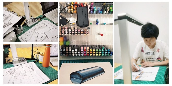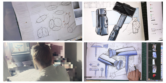 《手繪產品效果圖》是工業設計、產品設計專業重要的實踐類專業基礎課,講究的是“真操實干”。“由于設計專業的特殊性,大多學生的手繪基礎薄弱,為了保證教學質量,所以我們的手繪實踐課即使是在線上進行也要讓學生們真正動起手。”設計學院的孫嵐老師說道。為了達到實質等效的線上教學效果,孫老師創新教學手段和教學方法,借助騰訊會議和QQ兩個平臺,搭建了“電腦+實物投影儀+錄播燈”的簡易錄播室。線上教學時,孫老師的示范講解實時反映在學生的屏幕上,學生可以跟著老師邊學邊練。