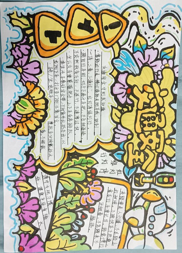 此次活動吸引了學生的積極參與,他們利用課余時間搜集資料,精心設計手抄報內容。同學們的作品不僅版面設計精美,而且主題多樣,涵蓋了交通信號識別、安全行走規則、騎行和乘車安全等多個方面,充分展示了學生們對交通安全重要性的認識和理解。活動參與者用手中的筆繪出生動的圖畫、寫下有力的文字,呼吁大家學習交通法規,并將其應用到日常生活中,共同營造一個安全、和諧的校園環境