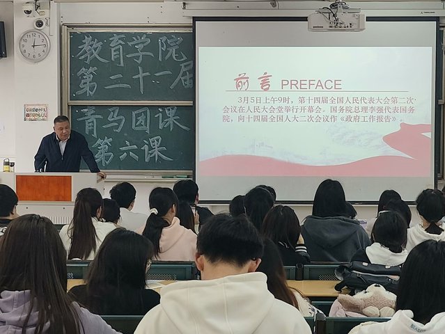 為了加強團員青年對于兩會精神的學習與貫徹,加強團員青年們的思想政治教育,提升團員青年們的思想理論水平和政治素養,豐富學生精神世界,提升思想境界。4月3日中午12點10分,合肥大學教育學院第二十一屆青馬團課第六課在三棟101教室順利進行,組織部部長朱思宇擔任主持人。