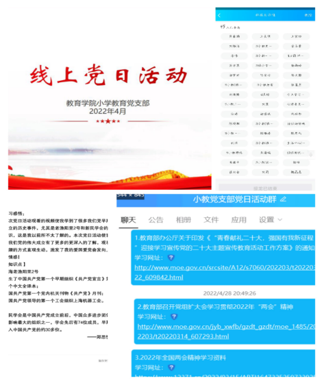 2022428日晚八點,教育學院小學教育黨支部組織全體黨員通過QQ線上視頻開展“持續學習,攜手防疫”線上主題黨日活動。本次活動由黨支部書記王多慈主持,支部黨員全員參與。