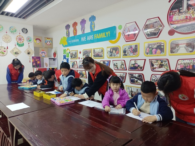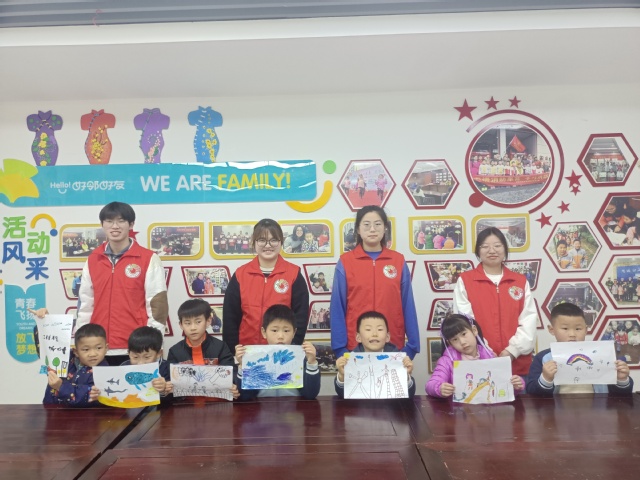 團(tuán)體心理輔導(dǎo)活動(dòng),心理志愿服務(wù)隊(duì)成員首先帶領(lǐng)小朋友們進(jìn)行“蘿卜蹲”熱身游戲活動(dòng)活躍了活動(dòng)的氛圍,孩子們之間的關(guān)系得到了小小的“破冰”。游戲結(jié)束后,團(tuán)體心理輔導(dǎo)活動(dòng)正式開(kāi)始,志愿者們開(kāi)始介紹本次活動(dòng)的主題是“分享快樂(lè)”通過(guò)游戲快樂(lè)的假期,讓孩子們回憶自己記憶最深刻的快樂(lè)假期時(shí)光,希望孩子們?cè)诎准埳袭?huà)出自己的快樂(lè)時(shí)光。繪畫(huà)環(huán)節(jié)中志愿者們負(fù)責(zé)維持活動(dòng)秩序,并協(xié)助孩子們進(jìn)行繪畫(huà)。