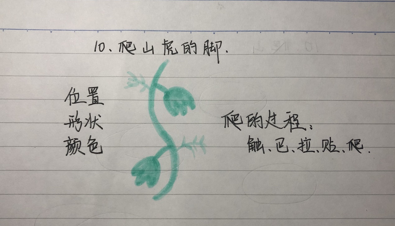 1、圖片導入:出示葡萄藤和爬山虎的兩張圖片。 師:同學們,大家抬頭看大屏幕上的這兩幅圖片,它們是什么呢?(生答) 師:對的,是葡萄藤和爬山虎。那現在再請同學們仔細觀察一下,他們之間有什么不同呢?哦!一個有架子,一個沒架子。是呀,葡萄藤得攀著架子才能向上爬。那大家動動你們聰明的小腦袋想一想,沒架子的爬山虎靠著什么往上爬呢?(生答) 師:沒錯,是腳。這節課就讓我們跟隨著作者葉圣陶爺爺一起去了解一下爬山虎的腳吧。請同學們伸出小手和老師一起板書課題。(板書:爬山虎的腳) 2、初識作家。 (1)師:這篇課文的作者是葉圣陶爺爺,那么,你了解葉圣陶爺爺嗎? (2)師:老師看到了大家渴望知識的小眼神,請看大屏幕,老師來給大家介紹一下這位著名作家吧。葉圣陶,原名葉紹鈞,是我國著名的作家、教育家。他創作了新中國第一部童話集《稻草人》,有著“優秀的語言藝術家”之稱。 【設計意圖:認識作者對學生學習非常重要。出示圖片,與生活有機銜接,通過對比導入新課,激發學生學習興趣。通過課件呈現作者的簡介,初識作家葉圣陶先生及其作品,拉近與文章的距離,激發學生的閱讀期待。】 (二)、字詞教學,初讀課文 1、師:接下來,我們就走進《爬山虎的腳》一課,去領略葉圣陶爺爺筆下的爬山虎的真容。請同學們自由朗讀課文,讀準字音,讀通句子,遇到難讀的地方多讀幾遍。并思考,課文都寫了爬山虎的什么呢? 2、指導字詞 (1)師:老師看到大家讀的非常認真,相信屏幕上的生字一定難不倒你們。誰想來挑戰一下讀一讀?(指名回答) (2)注意指導多音字“曲”。 (3)師:同學們讀的字正腔圓,老師非常喜歡聽你們朗朗的讀書聲。但是這些字不僅要會讀,還要會寫。誰給大家做一個書寫上的提醒?(指名回答,指導“疊”字) (4)出示生字:操、順、均、隙、柄 師:請同學們觀察這些生字的字形,你有什么發現呢?(指名回答) 師:是的,這些字都有一個共同的特點,都是左右結構的字,在書寫上要注意左窄右寬。眼觀千遍不如手過一遍,請同學們在自己的練習本上工工整整地把這些生字寫上一遍。在寫的時候要注意坐姿,認真書寫。同學們寫得非常認真,大家都很棒。 3、梳理全文 (1)師:接下來,我們跟著黑板上這幅圖畫整體感知《爬山虎的腳》。請小組之間互相交流學習,完成這幅圖畫。 (2)小組之間交流討論。 (3)師:老師看到大家討論的非常激烈,看來你們一定都有了自己的答案。哪個小組先來說一說?(指名回答) (4)師小結:我們根據這幅圖畫,學會抓住關鍵詞句進行提煉,很快就知道文章寫了什么。作者按順序先寫了爬山虎生長的位置,再寫葉子,最后寫爬山虎的腳。 【設計意圖:本課生字較多,其中以左右結構為主,個別難寫字教師重點指導,讓學生能夠達成正確書寫生字的效果。通過提供圖畫填空的方法,讓學生自主感悟、探究和交流,實踐掌握概括課文主要內容的方法。】 (三)、深入學習,品味語言 1、師:那接下來請同學們再次默讀課文,注意不出聲,不指讀。邊讀邊勾畫出你最喜歡的部分,慢慢的讀,細細的品。(生自由默讀) 2、師:誰來分享一下?(指名回答)哦,你最喜歡的是爬山虎的葉子。你能給大家讀一讀嗎?(生讀)讀得真好,讓大家覺得仿佛爬山虎的葉子就在眼前呢。 2、課件展示描寫爬山虎的葉子的語句。 (1)師:請同學們仔細觀察這幾個語句,有誰想嘗試著讀一讀?(指名朗讀) (2)理解詞語:出示“舒服”。 師:“舒服”這個詞語是什么意思?(生自由說意思) 師:老師聽到大家都有著自己的見解,“舒服”是看上去會讓人覺得賞心悅目的意思。文中作者想要表達的就是這個意思。 (3)比較句子:出示課件 一陣風拂過,一墻的葉子就漾起波紋,好看得很。 一陣風拂過,一墻的葉子就蕩起波紋,好看得很。 師:這兩個句子哪句更恰當,為什么?(指導學生體會“蕩起”與“漾起”的不同含義) 師:請同學們閉上眼睛,想象風吹時爬山虎葉子之美,再用自己的情感讀出葉之美。(生自由想象、朗讀) (4)師:這句話寫出了爬山虎的動態美。我們一般描寫植物只會寫植物的靜態,而葉圣陶爺爺把爬山虎的動態也寫得惟妙惟肖,非常值得我們學習和借鑒。 【設計意圖:通過對詞語的理解、比較、想象等方法品味語言,體會用詞的準確,從而理解文本內容。同時,引導學生在反復朗讀中感悟作者的觀察方法,觀察習慣。】 (四)、教師總結,布置作業 1、師總結:作者為什么能把葉子寫得這么美呢? (生答:認真觀察)是的,所以我們要學習作者認真仔細地觀察事物的方法,養成良好的觀察習慣。爬山虎的葉子之所以生機勃勃地鋪滿墻,這跟它的腳有著密切的聯系,爬山虎的腳又是什么樣的呢?我們下節課繼續學習。 2、布置作業: (1)將自己不會的字詞再次書寫幾遍。 (2)背誦自己喜歡的語句。 【設計意圖:通過懸念式總結本課的學習內容,為下節課的學習做準備,激起學生的學習興趣。作業布置再次復習鞏固本節課的學習內容。】 (五)、板書設計 第二課時 (一)、復習導入,明確目標 1、聽寫詞語:操場、嫩莖、舒服、均勻、重疊、空隙、葉柄、枯萎、牢固。 2、師:上節課,我們初步學習了《爬山虎的腳》,了解了課文大致的內容,書寫了生字,并且了解了爬山虎生長的環境以及葉子的樣子。爬山虎的葉子給你留下了怎樣的印象呢?(生自由答) 3、師:文章題目是“爬山虎的腳”,作者先寫了爬山虎的葉子。這是為什么呢?