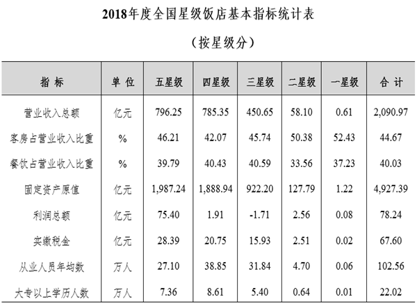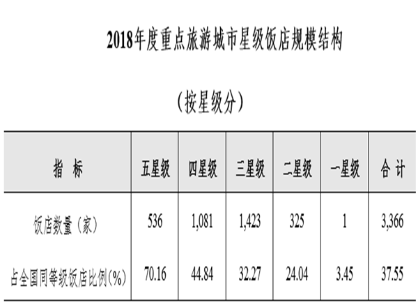 據(jù)中華人民共和國(guó)文化和旅游部發(fā)布的消息,截至2018年底,全國(guó)星級(jí)飯店統(tǒng)計(jì)管理系統(tǒng)中共有10249家星級(jí)飯店,其中一星級(jí)70家,二星級(jí)1844家,三星級(jí)4965家,四星級(jí)2527家,五星級(jí)843家。完成填報(bào)的為9994家,填報(bào)率為97.51%。