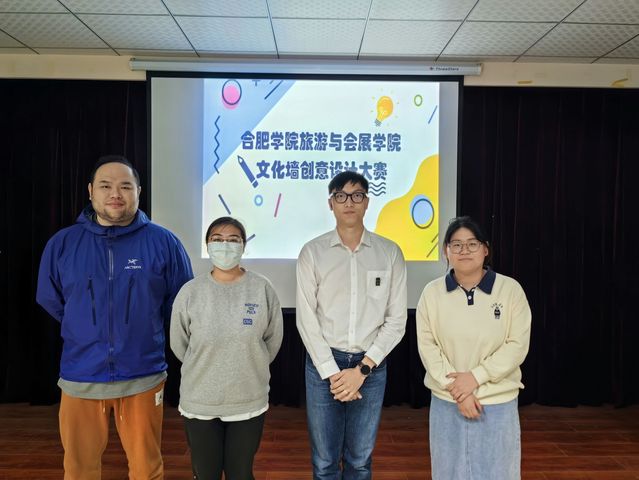 首先由兩位主持人介紹本次校園文化墻決賽的規則:每支參賽隊伍對本隊的文化墻設計方案進行六分鐘以內的演講。然后,由三位評委對選手的作品提出相關問題并對其作品提供修改意見。最后,根據評委的綜合打分決出名次。主持人宣布比賽正式開始后,四支隊伍依次上臺介紹文化墻設計方案,每支隊伍都顯現出了各自的特色。講解完成后,評委們對每隊做出點評和改進的建議。經過認真嚴謹的評選,馬踏飛燕隊榮獲一等獎,九十九朵玫瑰送給你隊榮獲二等獎,啊對對隊與皖風皖韻隊榮獲三等獎。每支隊伍與評委合影留念后,旅游與會展學院校園文化墻比賽決賽圓滿結束。
