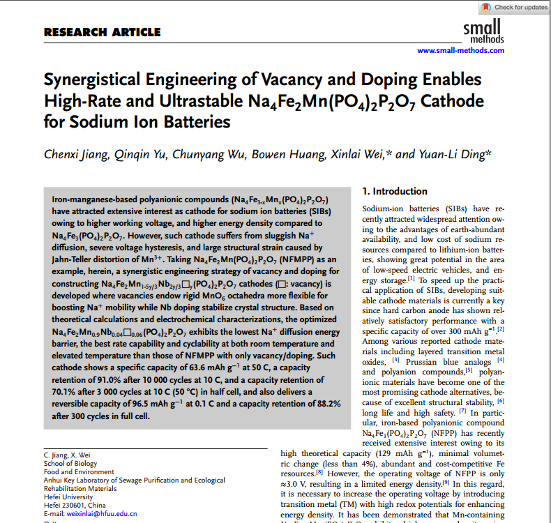 2025年5月,合肥大學生物食品與環境學院22級資源與環境專業研究生蔣晨熙以第一作者身份在國際學術期刊《SmallMethods》(IF=10.7,中科院二區)發表了題為“SynergisticalEngineering of Vacancy and Doping Enables High-Rate and UltrastableNa4Fe2Mn(PO4)2P2O7Cathode for Sodium IonBatteries”的研究論文。我校高級實驗師衛新來、湖南大學教授丁元力為通訊作者,合肥大學為第一完成單位。