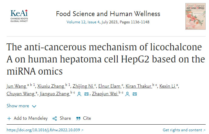 近日,我校生物食品與環境學院食品科學專業青年教師王郡博士在國際食品科技研究領域頂級期刊《FoodScience and HumanWellness(食品科學與人類健康)IF2022=8.022,中科院農林科學Q1,食品科技Q1)在線發表了研究論文,該論文的題目為《Theanti-cancerous mechanism of licochalcone A on human hepatoma cellHepG2 based on the miRNAomics》(基于miRNA組學研究甘草查爾酮A對人肝癌細胞HepG2的抗癌機制)。該研究在miRNA組學水平上解析甘草活性成分——甘草查爾酮A對人肝癌細胞HepG2的抗癌作用,為清晰認識到甘草的營養價值和藥理學作用提供了新的視角。