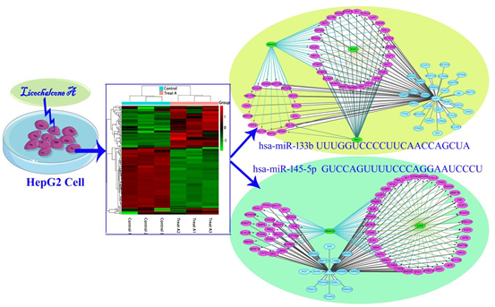 本研究利用團隊前期建立的miRNA組學技術,嘗試在miRNA組學水平上揭示甘草查爾酮A對人肝癌細胞HepG2的抗癌作用機制。甘草查爾酮A處理HepG2細胞后,共鑒定出102DE-miRNA,其中SP1被認為是調控DE-miRNA的主要轉錄調控因子。對DE-miRNA的靶基因進行預測和富集通路分析,發現FoxO通路是核心富集通路。通過構建miRNA-靶基因調控網絡鑒定出關鍵DE-miRNAhsa-miR-133bhsa-miR-145-5p),并進一步構建關鍵DE-miRNA-靶基因-轉錄因子的三級調控網絡,在miRNA水平闡明甘草查爾酮A對人肝癌細胞HepG2的抗癌作用機制。