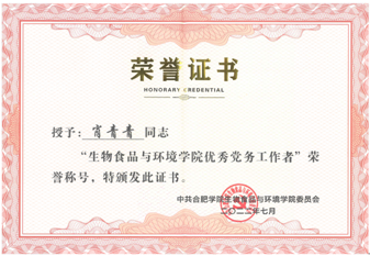 肖青青,女,博士,副教授,1984年生。2014年博士畢業(yè)于中山大學(xué),2015年1月至2017年7月進入安徽省農(nóng)業(yè)科學(xué)院工作,任助理研究員,2017年8月進入合肥學(xué)院生物食品與環(huán)境學(xué)院工作,兼任2017級碩士研究生輔導(dǎo)員,2018年9月至今擔(dān)任生物食品與環(huán)境學(xué)院食品質(zhì)量與安全教工黨支部書記,2018年12月被評為副教授,2020年1月以來同時擔(dān)任食品工程系主任、食品質(zhì)量與安全專業(yè)負責(zé)人。2017年8月至今在合肥學(xué)院生物食品與環(huán)境學(xué)院食品質(zhì)量與安全專業(yè)工作,2018年擔(dān)任食品質(zhì)量與安全教工黨支部書記,2020年擔(dān)任食品工程系主任、食品質(zhì)量與安全專業(yè)負責(zé)人。在社會學(xué)術(shù)團體層面,2015年被評為國家油料作物質(zhì)量安全風(fēng)險評估崗位專家,2020年安徽省農(nóng)產(chǎn)品安全專業(yè)委員會理事,2021年合肥市食品行業(yè)協(xié)會理事。以下是肖青青同志的個人事跡具體情況: