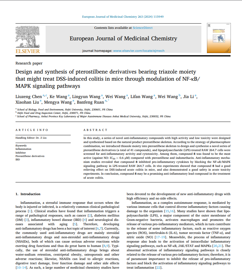 合肥學院阮班鋒團隊:Design and synthesis of pterostilbene derivatives bearing triazole moiety that might treat DSS-induced colitis in mice through modulation of NF-κB/MAPK signaling pathways