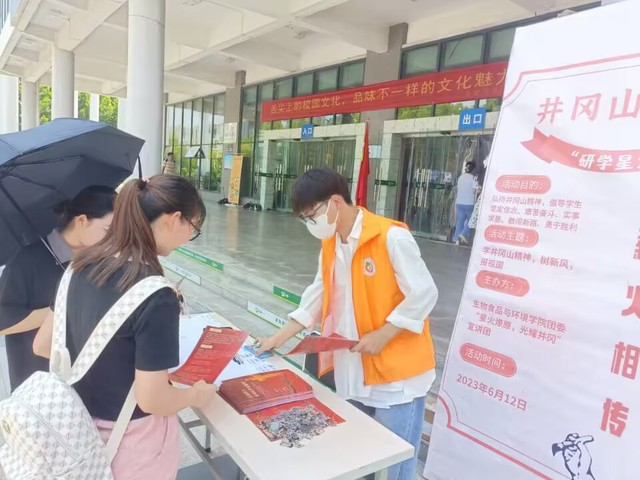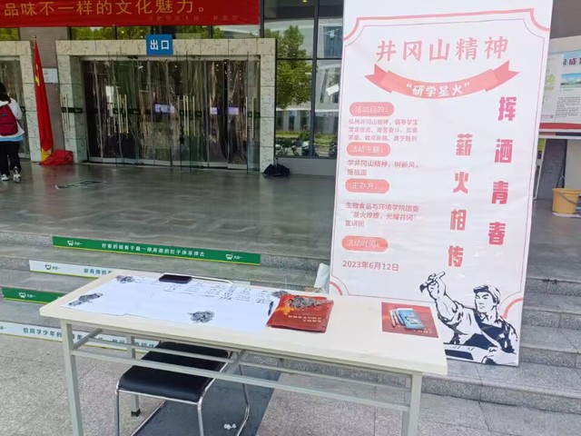 為深入學(xué)習(xí)宣傳貫徹習(xí)近平新時代中國特色社會主義思想和黨的二十大精神,引導(dǎo)動員青年學(xué)生大力弘揚井岡山精神,加強學(xué)生紅色基因教育傳承。2023612日在生物食品與環(huán)境學(xué)院團委的指導(dǎo)下,合肥學(xué)院“星火燎原,光耀井岡”宣講團于二期食堂門口舉辦了“研學(xué)星火”活動,活動主題為“學(xué)井岡山精神,樹新風(fēng),報祖國”。