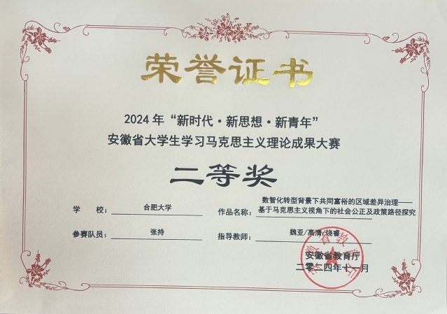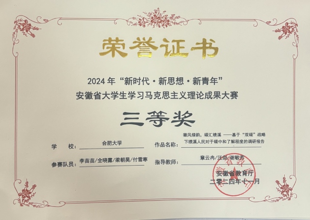 日前,由安徽省教育廳主辦的2024年“新時代?新思想?新青年”安徽省大學生學習馬克思主義理論成果大賽圓滿落下帷幕。我校選送的作品榮獲二等獎3項、三等獎1項。