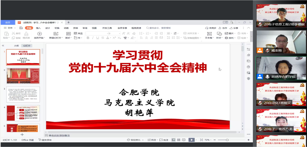 5月1日晚,先進制造工程學院分黨校第五期入黨積極分子通過騰訊會議平臺開展了第三次黨課教學,本次黨課由馬克思主義學院黨委書記、院長胡艷萍教授主講,機制學生黨支部書記威力旺老師主持,先進制造工程學院分黨校第五期入黨積極分子班共124名學員參加了本次課程,本次授課主題是“學習貫徹黨的十九屆六中全會精神”。 胡艷萍院長在課程開始圍繞中國共產黨十九屆中央委員會第六次全體會議通過的《中共中央關于黨的百年奮斗重大成就和歷史經驗的決議》展開。胡院長以安徽的發展為例,以“十個明確”的內容為脈絡,通過對安徽各地發展的實例,闡述了在黨的領導下、在新時代背景下,全國各地在經濟建設、文化建設、社會建設、生態文明建設等多個方面取得的進步。通過胡院長的講述,我們不僅詳細的了解到建黨百年以來,黨所面對的困難和黨領導人民創造的歷史性成就,而且更加深刻的理解了“十個明確”的思想理念和精神內涵。 胡艷萍院長接著圍繞以史為鑒、開創未來展開話題,講述當代青年應當從黨的百年奮斗歷程中汲取知識和力量,做到:(一)堅定歷史自信,自覺堅守理想信念;(二)堅持黨的政治建設,始終保持黨的團結統一;(三)堅定擔當責任,不斷增強進行偉大斗爭的意識和本領;(四)堅持自我革命,保證黨不變質、不變色、不變味。并在課程最后對所有學員提出殷切希望,希望大家把慶祝建黨百年激發的愛黨愛國愛社會主義熱情傳遞下去,把全黨全社會的精氣神進一步振奮起來。 在胡院長授完黨課之后,培訓班全體學員反響熱烈,大家紛紛表示,要深入學習貫徹全會精神,堅定理想信念,牢記初心使命,埋頭苦干、勇毅前行,為實現中華民族的偉大復興而不懈奮斗。(先進制造工程學院 馬克思主義學院) |