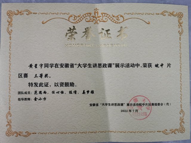 經過馬克思主義學院主辦的合肥學院首屆大學生講思政課比賽選拔,我校派出六組獲得校內一等獎的同學參加2022年安徽省“大學生講思政課”皖中片區賽。經過激烈的角逐,我校馬克思主義學院金小方老師指導的教育學院兩組同學獲得三等獎:一組是2020級小學教育1班黃星宇、范思雨、任心怡、陳倩、姜夢雅,參賽的課程是《習近平新時代中國特色社會主義思想概論》,選題是《生態優先,綠色發展》;另一組是2020級學前教育班胡明艷、張曉東、黃弘蕊、虞錦琳,參賽的課程是《形勢與政策》,選題是《砥礪奮進新征程,攜手邁向共富裕》。