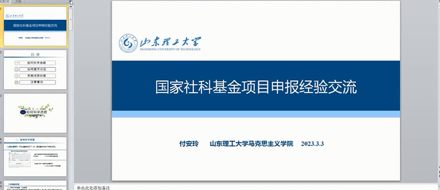 為進(jìn)一步提高馬克思主義學(xué)院教師申報(bào)國(guó)家社科基金項(xiàng)目的積極性、營(yíng)造濃厚的學(xué)術(shù)氛圍,2023年3月3日上午,馬克思主義學(xué)院邀請(qǐng)中宣部“馬克思主義理論骨干人才計(jì)劃”(“百人計(jì)劃”)首批博士、山東理工大學(xué)高層次人才“雙百工程”第二層次、碩士生導(dǎo)師付安玲教授為學(xué)院教師作“國(guó)家社科基金項(xiàng)目申報(bào)經(jīng)驗(yàn)交流”的學(xué)術(shù)報(bào)告。本次報(bào)告由合肥學(xué)院科研處和馬克思主義學(xué)院主辦、合肥學(xué)院科協(xié)協(xié)辦,通過(guò)騰訊會(huì)議方式進(jìn)行,90余名教師聆聽了此次報(bào)告。 付安玲教授從“如何科學(xué)選題”、“如何展開論證”、“前期成果積累”以及“注意事項(xiàng)”四個(gè)方面分享了申報(bào)國(guó)家社科基金項(xiàng)目的成功經(jīng)驗(yàn)。報(bào)告深入淺出、語(yǔ)言生動(dòng),對(duì)選題依據(jù)、研究?jī)?nèi)容、思路方法、參考文獻(xiàn)等具體論證過(guò)程中的易錯(cuò)點(diǎn)和注意事項(xiàng)進(jìn)行了詳盡的闡述。 最后,主持人蘇冰院長(zhǎng)對(duì)付安鈴教授的精彩報(bào)告表示感謝,并鼓勵(lì)老師們繼續(xù)努力,向?qū)<覀兌鄬W(xué)習(xí)多交流,不斷拓展教科研的思路和視野,積極投身合肥學(xué)院科研事業(yè)發(fā)展中。 |