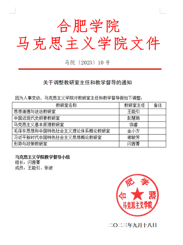 關(guān)于調(diào)整教研室主任和教學(xué)督導(dǎo)的通知(馬院〔2023〕10號(hào)).doc
