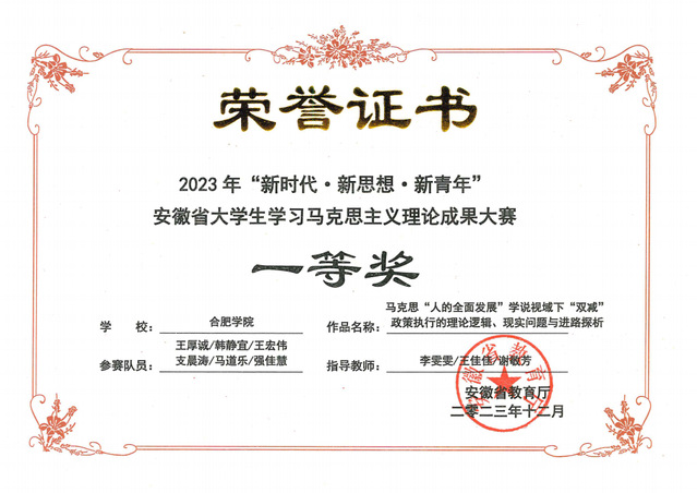我校學子在2023年“新時代·新思想·新青年”安徽省大學生學習馬克思主義理論成果大賽中獲得一等獎