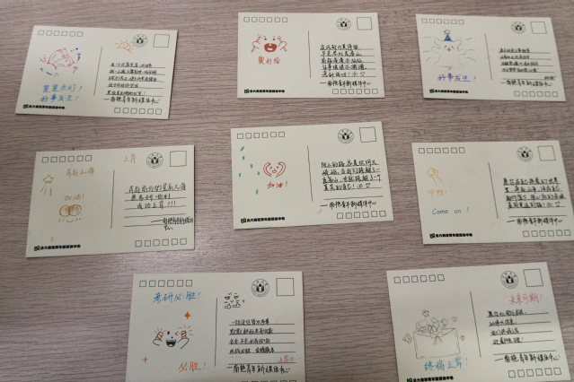 南艷青年新媒體中心精心策劃,制作了滿載深情的精美明信片,承載著對考研學子誠摯的祝福。考研自習室里,學子們聚精會神、筆耕不輟,為實現夢想而不懈奮斗。南青成員們輕聲推門,將一張張飽含祝福的明信片送到考研學子的手中,并與他們進行簡短而溫馨的交流,用鏡頭記錄下這份溫暖的舉動。這些由南青成員手寫的明信片,不僅是祝福,更是力量的象征,為考研學子提供了心靈的慰藉,溫暖的話語猶如冬日爐火,給十一月的自習室帶來融融暖意。“明信片畫的好棒,謝謝學弟學妹們!”奮力備戰的學姐在鏡頭前留下明媚笑容。隨著一張張明信片的傳遞,活動在一篇溫馨和諧的氛圍中圓滿結束。