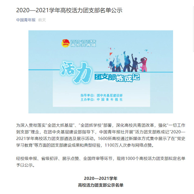 我校在接到團省委具體工作通知后,認真組織校級優秀團支部申報,來自11個學院的20余個團支部提交申報材料。經校級遴選,2018級通信工程1班團支部推薦至團省委,團省委經過初評,推薦53個團支部參加全國評選,全國評選活動期間,1600所高校通過新媒體方式集中展示了在“黨史學習教育”等方面的團支部建設成果和典型經驗,1100萬人次參與網絡點贊,全國共評選出“活力團支部”1000個。