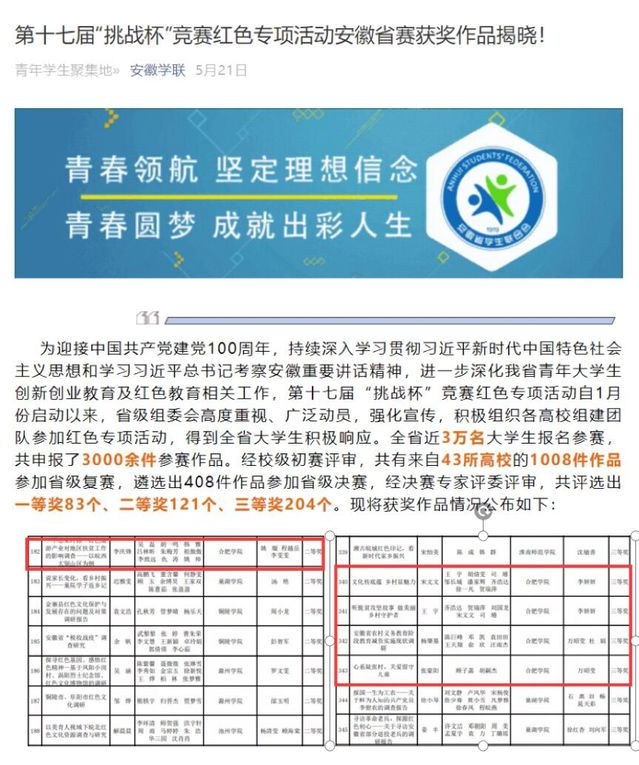 今年“挑戰杯”安徽省大學生課外學術科技作品競賽同時開通了紅色專項賽道,我校學生積極參賽,共申報參賽作品11件,經省賽組委會評審,最終我校獲得省級二等獎1項、三等獎4項。
