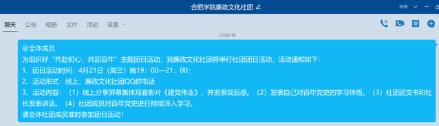 2021年4月21日,廉政文化社為回顧黨的光輝歷史,謳歌黨的豐功偉績,繼承發揚黨的光榮傳統和優良作風,特于線上舉辦的“齊赴初心,共迎百年”特別主題團日活動。參加此次活動的主要有廉政文化社全體理事及部分社員。