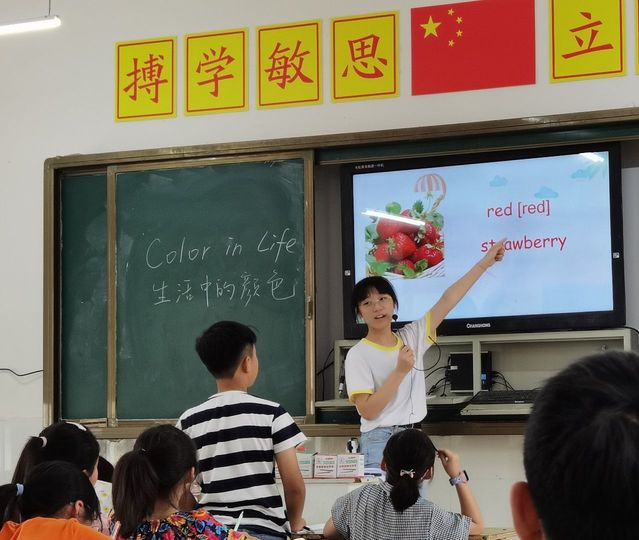 上午9:00-11:00的支教志愿者們為丁集鎮中心學校的小學生們上了黨史文化育人課、頭腦風暴拓展課和英語思維發展課。黨史文化育人課,志愿者帶同學們領略了磅礴大氣的詩詞;頭腦風暴拓展上,大家跟隨著志愿者講課的內容,發散數學思維,拓展課外知識。上午的最后一節,志愿者帶著小朋友們認識身邊五彩繽紛的顏色,并結合顏色的直觀感受和英文發音,帶領小朋友們跟讀,啟發了小朋友們對于英語學習的興趣。