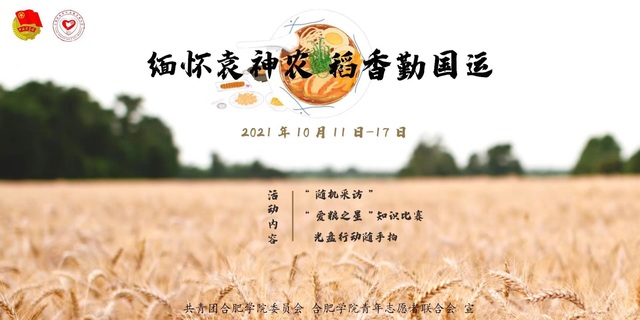今年的10月16日是第四十一個世界“糧食日”,根據安徽省《關于做好2021年世界糧食日和全國糧食安全宣傳周活動的通知》,10月11日-17日,我校青年志愿者聯合會以“緬懷袁神農,稻香勤國運”為主題,開展了形式多樣的糧食安全宣傳教育活動。